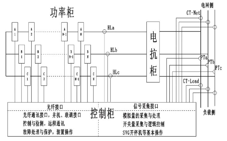 安徽中電HSVG高壓動態(tài)無功補(bǔ)償裝置由控制柜、功率柜、電抗器組成。控制柜主要控制箱、二次控制邏輯電路,其中控制箱通過光纖連接到功率單元。在功率柜里有三相功率單元,根據(jù)電網(wǎng)電壓等級不同,每相由若干個功率單元串聯(lián)組成,最后通過電抗器接入電網(wǎng)。